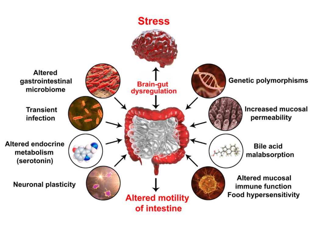La patofisiologia non è completamente compresa, ma diverse anomalie sembrano contribuire alla sua patogenesi, incluse la dismotilità intestinale, l’ipersensibilità viscerale, l’infiammazione della mucosa di basso grado e le alterazioni del microbiota ma soprattutto la distruzione dell’asse intestino-cervello (bidirezionalità intestino-cervello).