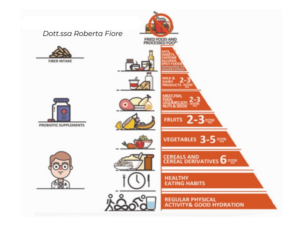 La piramide IBS è costruita sulla base delle attuali linee guida e della letteratura esistente sulle raccomandazioni dietetiche e sullo stile di vita. Le raccomandazioni sono disposte sulla base della frequenza di assunzione raccomandata in ordine ascendente, dal più al meno frequente. Sul lato sinistro ritroviamo raccomandazioni sul consumo di fibra, sulla supplementazione con probiotici e sull’importanza di essere seguiti da un nutrizionista esperto, per non incorrere in carenze nutrizionali.