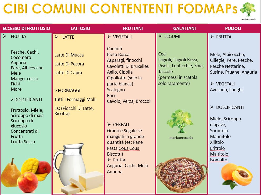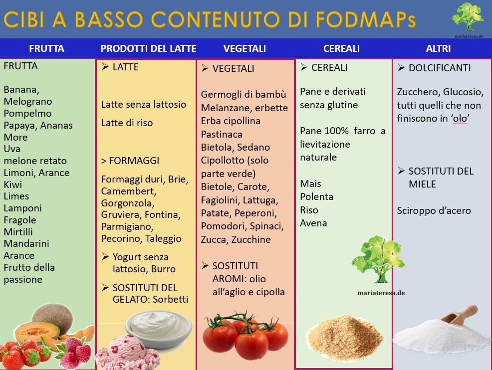 Un approccio dietetico per alleviare e ridurre i sintomi è la dieta low-FODMAP, che consiste in una prima fase di esclusione dei cibi ad alto FODMAP della durata di 3-4 settimane ed una successiva fase di reintroduzione. Gli alimenti da escludere sono quelli contenenti frutto-oligosaccaridi e galatto-oligosaccaridi, lattosio, fruttosio e tra i polioli xilitolo, maltitolo, sorbitolo ecc.